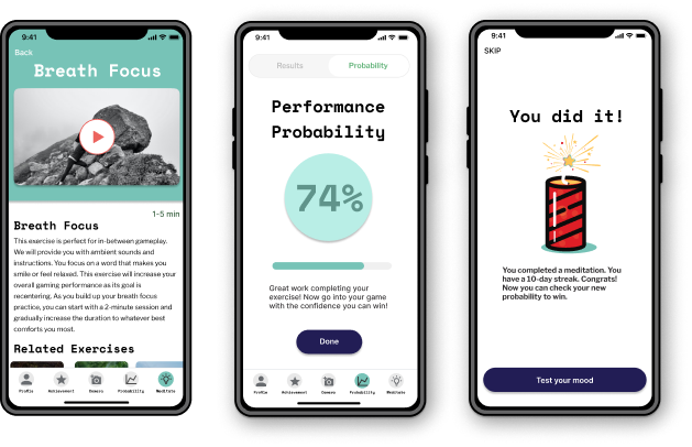 Design a mobile gaming app that enhances the overall gaming experience by utilizing mood analysis and probability of winning to provide personalized meditations during breaks, thereby improving gamer's performance for their subsequent matches.
